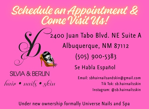 Welcome to S&B Hair, Nails & Skin, your go-to beauty destination in Albuquerque, NM. Conveniently located at 2400 Juan Tabo Blvd NE, Suite A, we are committed to helping you look and feel your absolute best. At S&B, we offer a full range of professional services including haircare, nail care, and skincare treatments. Whether you’re here for a stylish haircut, a relaxing manicure and pedicure, or rejuvenating skincare, our experienced team is dedicated to providing high-quality services tailored to your unique needs. Our mission is simple: to create a warm, friendly, and relaxing atmosphere where every client leaves feeling refreshed, confident, and beautiful. With a focus on hygiene, professionalism, and the latest beauty trends, we take pride in delivering results you’ll love. ✨ Come visit us today and experience why our clients trust us with their beauty needs. 📍 Address: 2400 Juan Tabo Blvd NE Suite A, Albuquerque, NM 87123 📞 Phone: (505) 900-5383